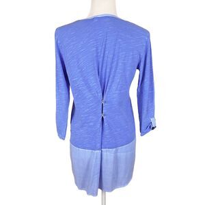 Fresh Produce Two-Tone Tunic Top Size S Blue Cotton Blend Button-Back 3/4 Sleeve. Top is in very good preowned condition. 100% slub cotton top with viscose panel at hemline in lighter shade of blue. Lighter blue trim at neckline and on sleeve tab. 3/4 sleeves with tab detail at cuff. Back cinches with 2 buttons and loops. Slightly longer in back.