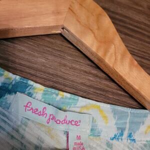 Fresh Produce Womens All Over Print Blouse Top M Blue Green V-Neck Button Cotton