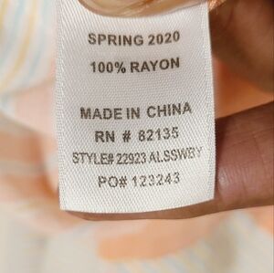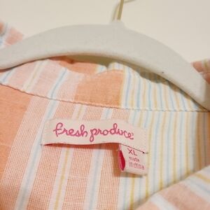 Women's pink, melon (light orange) and white striped button-down shirt by Fresh Produce, size XL. Shirt has a front button pocket, buttons on wrists and a slight pleat in the back of the shirt. Fabric is 100% rayon. Lightweight shirt is versatile and in excellent pre-owned condition; no flaws.