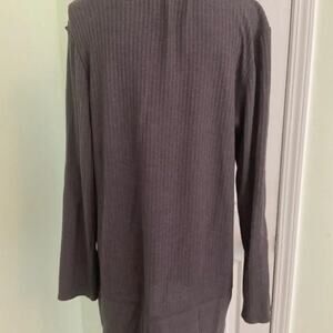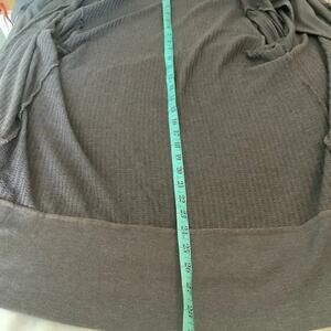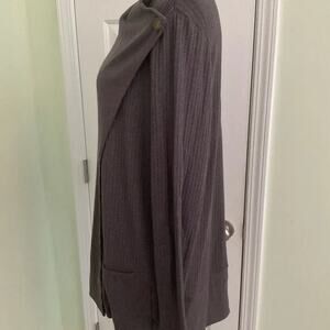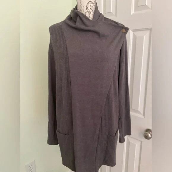Fresh Produce gray sweater wrap that has button closures on each side at the shoulder. Has front pockets.