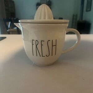 Charming ceramic citrus juicer with 'Fresh' print. Perfect for squeezing lemons and limes.