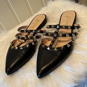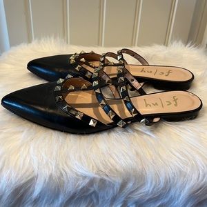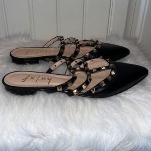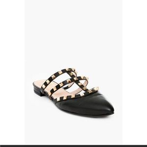 Chic black mules with tan straps. Studded detailing. Slip-on style. Perfect for casual wear.