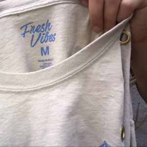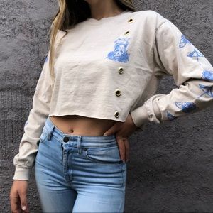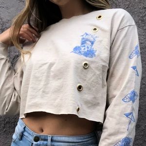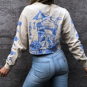 Fresh vibes fresh to death cream long sleeve crop T-shirt with baby blue tropical piña colada umbrella drink school graphic on front and back. Super cute tropical graphic detail up sleeve. Originally a size medium fits true to size.