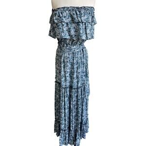 Fresha London Strapless Tiered Ruffle Maxi Leaf Palm Print Dress XS
