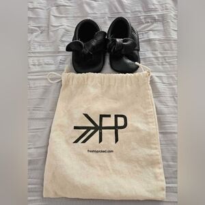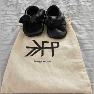 Stylish and comfortable black Freshly Picked Moccasins shoes for baby. Perfect for any occasion. 0/1 for 3-6 months baby.