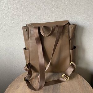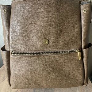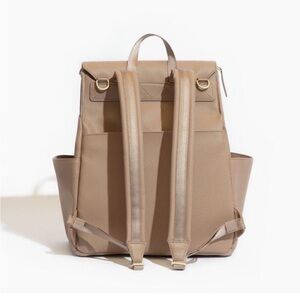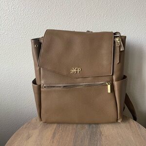 Stylish tan baby bag by Freshly Picked. Features front zipper pocket and side compartments. Perfect for on-the-go moms.