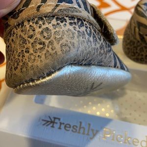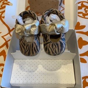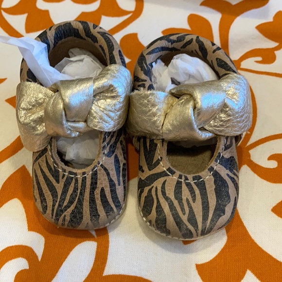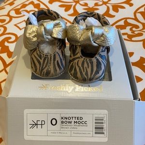 Freshly Picked knotted bow baby moccasins Weathered Brown Zebra print. Size 0. Great condition, some fading on toe and inner sole. Top quality genuine leather moccasins.