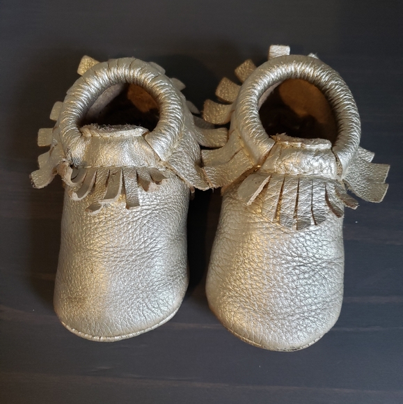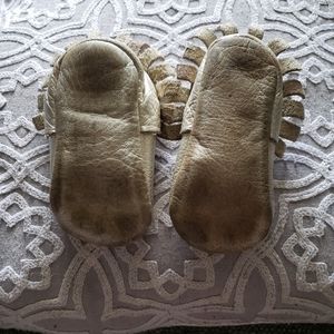 Gold moccasins in used condition have not tried to wipe bottoms. No holes or tears still in great condition.