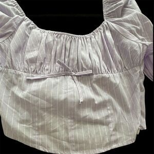 Keywords: Freshman 1996, women's blouse, purple blouse, square neck, balloon sleeves, striped pattern, tie-front, casual wear, spring fashion, medium size, regular fit, machine washable, new condition.