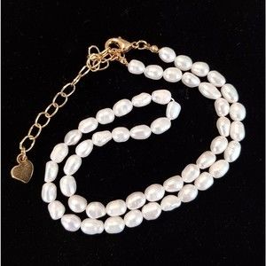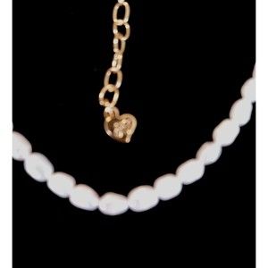 Freshwater pearl necklace with gold tone clasp. Necklace can be worn at collar or as a choker. Is signed "FS" on a heart shaped tag at clasp.