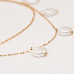 Single lobster clasp closure with two chains and imitation freshwater pearl accents.
