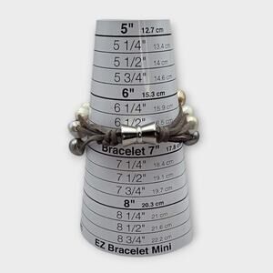 Beautiful multi-strand bracelet featuring genuine freshwater pearls in shades of cream, gray, and champagne. The pearls are hand-knotted on soft gray suede leather cords, creating a chic, bohemian look. Finished with a secure silver-tone magnetic clasp for easy wear.