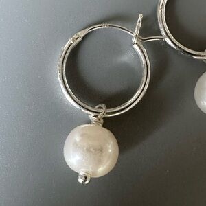 Sterling silver huggie hoop earrings feature dangle freshwater pearls. The perfect marriage of everyday earrings and elegant evening wear. Genuine sterling silver and e-coated for anti-tarnish protection, extra durability, and protection of your tiny hoop earrings.