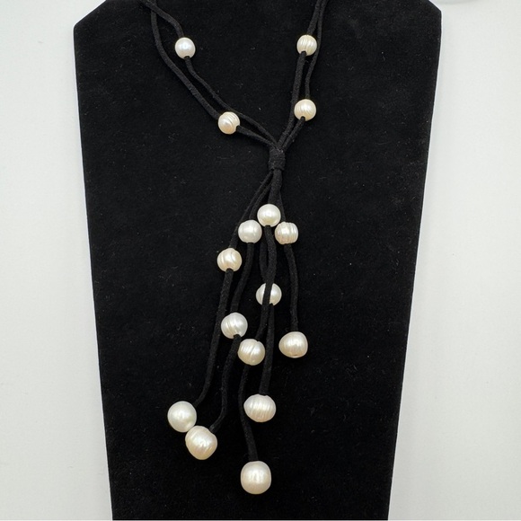 Stunning freshwater pearl tassel necklace with a boho-luxe vibe. Features genuine baroque pearls strung on a soft black suede-like cord. Necklace measures 28 inches plus a 6-inch pearl tassel drop, perfect for layering or wearing as a long lariat.