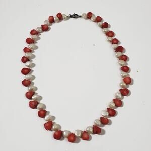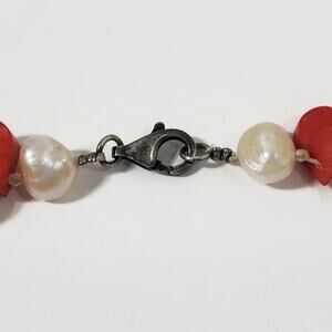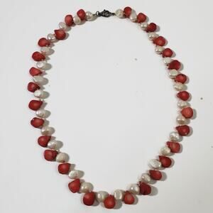 Freshwater Pearl & Teardrop Shaped Red Coral Bead Sterling Silver Necklace 20"
