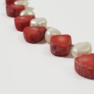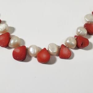 This is a beautiful freshwater pearl and teardrop shaped red coral bead necklace. The beads are hand knotted. Due to the natural variations of the materials there may be some irregularities.