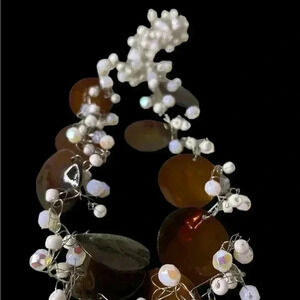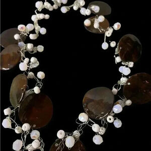 Smaller pearls and beads with brown shells on this delicate wrap necklace. Necklace stretches to 26” but is a wrap necklace made to be worn as a choker or shorter necklace.