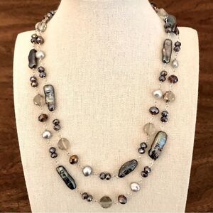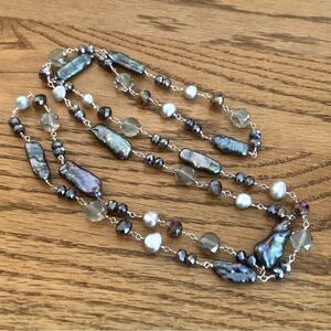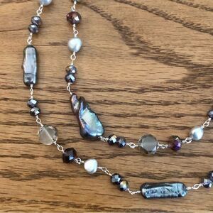 Handmade, freshwater Pearl and crystal beaded necklace. Gorgeous iridescent freshwater pearls with tones of metallic grey, pink and purple. Perfect for layering!