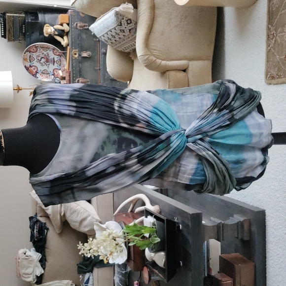 Another Australian designer, in an Australian size 12 which is more like a US 10. Very sheer loose draping material across front to give coverage so you don't have to wear really anything underneath. Material is cotton silk. small imperfection at the bottom of zipper at the back. see picture