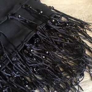 Elegant Freya black sheer scarf with delicate beaded fringe ends. Lightweight and versatile, perfect as an evening wrap, party accessory, or chic layering piece.