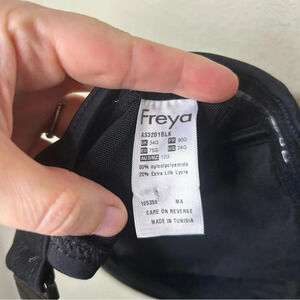 Black bikini top from Freya. Size 34G. Lightly lined. Has underwire. Clasps in the back. In very good used condition.