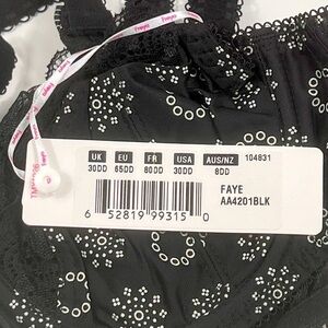 Featuring the Faye underwire plunge bra from Freya. Three-part, balcony cups feature see through lace at the top and silky fabric with a geometric pattern on the bottom of the cup.