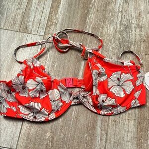Vibrant red bikini top. White floral pattern. Halter neck design.