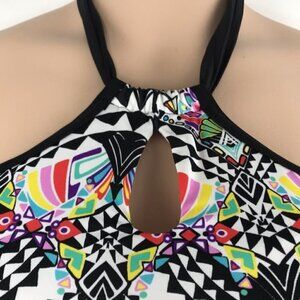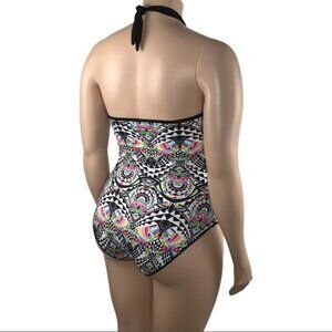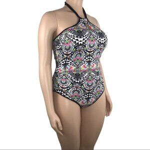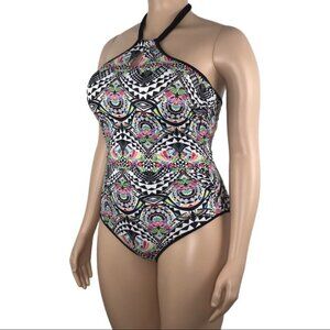 Whether you're lounging by the pool or relaxing at the beach, feel stylish and supported in this gorgeous bra-sized one piece swimsuit featuring an abstract monochrome geo print with beautifully bold accents of color.