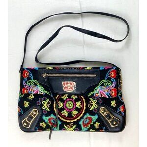 High quality and exotic, Fricaine "Treasure" handbag in black with multi color embroidered floral and butterfly pattern. Gold tone hardware. Two options for folder over top, adjustable snap closure. Detachable crossbody strap 48", with a 21.5" drop. The inside is lined with a beautiful pink satiny material. There are three interior pockets and a divider. Perfect condition, never used with protective plastic over the logo.