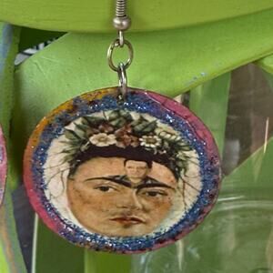 Pair of Frida Kahlo earrings. Circular and featuring N illustration of her face with a glitter outline. The earrings are very lightweight metal and dangle. The banks are pink metal with colorful yellow paint splotches.