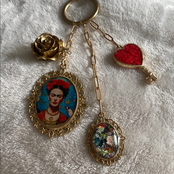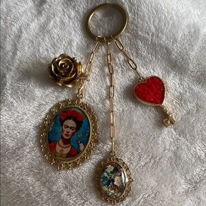 Frida Kahlo Gold BAG PURSE CHARM RED FLOWER FRAME KEY VINTAG