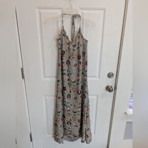 Elegant floral maxi dress in a soft gray hue. Perfect for any occasion with its flowing design and Frida Kahlo printed pattern.
