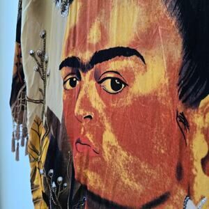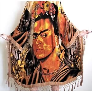 Gorgeous, vibrant hand-made vintage silk, burnout velvet kimono duster with open front and long sleeves. Featuring the famed painter Frida Kahlo, known for her vibrant self-portraits and depictions of pain, passion, along with her unique blend of Mexican culture and Surrealism. Embellishments include: embroidery, beads, sequins, beaded tassels and fishnet fringe around hem and sleeve cuffs.