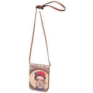 The Frida Small Crossbody Purse is a stylish and colorful accessory for women, featuring a rectangular shape with a snap closure. Made of faux leather with a matte finish, this purse is lightweight and perfect for travel or casual occasions. The brown crossbody strap adds a touch of elegance, while the interior includes inner pockets for organization. The exterior is adorned with a solid multicolor pattern and a unique Frida character design, making it a perfect choice for those who appreciate art and bohemian aesthetics.