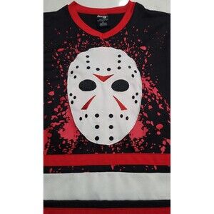FRIDAY THE 13TH OFFICIAL. JASON VORHEES. BLOODY HOCKEY JERSEY. SMALL. PRE OWNED. IN EXCELLENT USED CONDITION. PLEASE VIEW ALL PHOTOS ABOVE FOR MEASUREMENTS AND PROOF OF CONDITION. STORED IN A CLIMATE CONTROLLED SMOKE-FREE AND PET-FREE HOME. SHIPS PROMPTLY AND SECURELY.