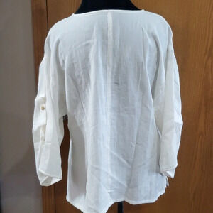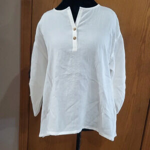 off white excellent condition no issues tunic top with button gathered sleeves and split sides size medium linen by fridaze