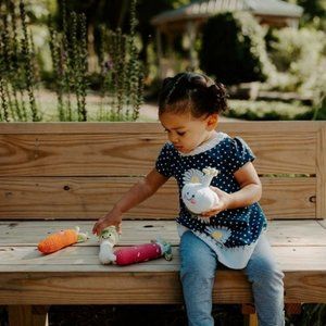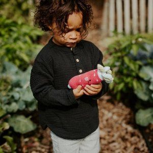 This bright pink and white radish can’t wait to join the other fruits and veggies in your baby’s kitchen. It is the perfect size for tiny hands to grab onto, and the rattle inside this knit toy gives a soft sound when shaken.