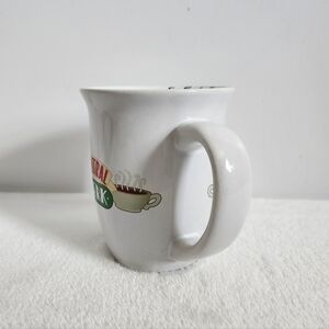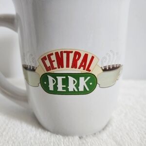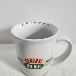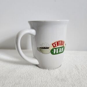 Friends Popular TV Series Central Perk Silver Buffalo White Ceramic Coffee Cup Mug. Perfect for any decor to display or for drinking! 16 oz, double-sided images, Friends logo inside brim, wide flared rim, microwave and dishwasher safe. No cracks or chips. Some staining inside mug, otherwise in great condition!