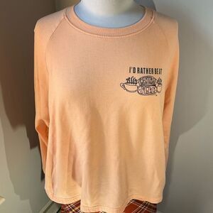 Friends Cropped longsleeve sweatshirt. Peach. Medium. Dolman sleeves, straight cut, crewneck. Graphic on left chest “I’d rather be at Central Perk.” Coffee cups. Super soft, yet some light pilling, but I think it is the nature of the fabric. So cute! #friends #centralperk #y2k