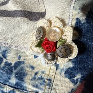 Custom Friends themed jacket. The back design features Phoebe’s Smelly Cat Records, with bleach tie-dye effects and includes (6) handmade doily flower pins and (6) Friends show pins. The colorful floral interior oversized pockets are perfect for smuggling snacks.