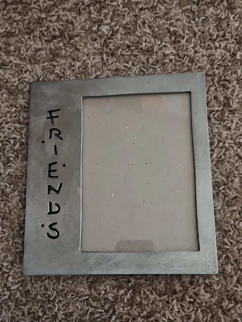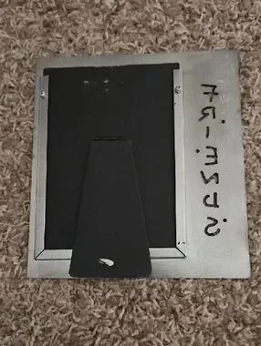 Simple metal photo frame with a rustic finish. Features vertical "FRIENDS" lettering for a personalized touch. Designed to showcase and celebrate memories in a stylish way. Silver color complements neutral and modern décor. Photo area is 4.5 inches x 6.5 inches