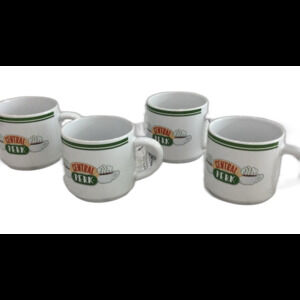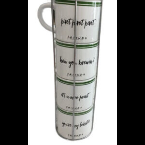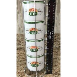Friends TV Series Central Perk 4 Graphic Ceramic Coffee Mugs with Holder. LNWOT. Please reference attached pictures for graphics, colors, condition, size and stacking tower.