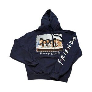 This Friends hoodie is great for everyday wear! Hoodie features a group shot of the iconic Friends group sharing milkshakes and ice cream. Friends logo on the arm sleeve of the left arm. Hoodie is dark blue. Hoodie is in good condition; no stains or damaged fabric. Size: Small.