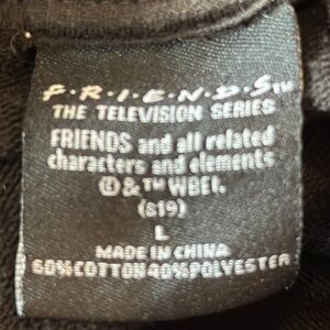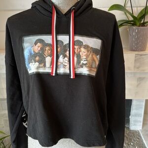 Cropped black hoodie with the cast of Friends on it and Friends in White letters down the arms. 60% Cotton/40% Polyester. Machine wash cold with like colors. Non chlorine bleach. Tumble dry low. Imported. Size Large. Approximate measurements laid flat: 20@ long. Drop Shoulders 27”. Armpit to Armpit 25”. Across bottom 25.5”. Excellent Used Condition with no Flaws. Smoke & Pet Free Home. Shipping Samee Day or Next! Bundle & Save!