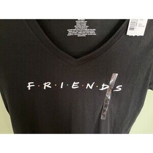 Up for sale is this Friends the Television Series Women's Short Sleeve V-Neck Tee Shirt Black Medium. New with tag. 65% polyester and 35% rayon. Armpit to armpit: 16.5" Length: 26"