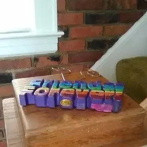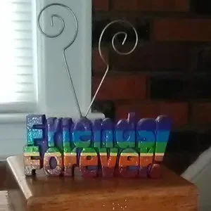 Friends Forever Photo Tree....colorful and sparkly "Friends Forever" /2" high X 5" wide x 5/8" deep base...wires are silver-toned 3.5" and 4" high...holds any size photo...bottom seems to have been patched during manufacturing...made in China