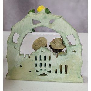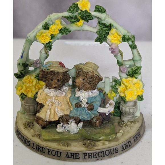Super cute friendship bears figurine. It's made from resin that has been sculpted and painted. It depicts two bears in fancy dresses with hats, sitting on a bench together and drinking tea. There's a floral arch and gate in the background, with beautiful yellow flowers. Around the base it says "Friends like you are precious and few." Great as a gift for a friend, and for bear collectors!