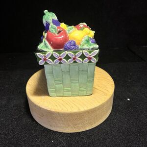 Add a vibrant pop of charm to your space with this ceramic lidded keepsake box from the Friendship Garden collection by United Design. This beautifully glazed piece features a hand-painted basket overflowing with bright fruits and vegetables, and comes with its original message card: From tiny seeds of kindness, great friendships grow. Maker: United Design Friendship Garden Collection Year: 2002 Material: Hand-painted ceramic Design: Textured green basket base with floral trim and colorful fruit/veggie lid Includes original card insert Marked on base with official Friendship Garden stamp Measures approx. 3.25 H x 2.75 W Perfect as a gift box, trinket holder, or collectible shelf display