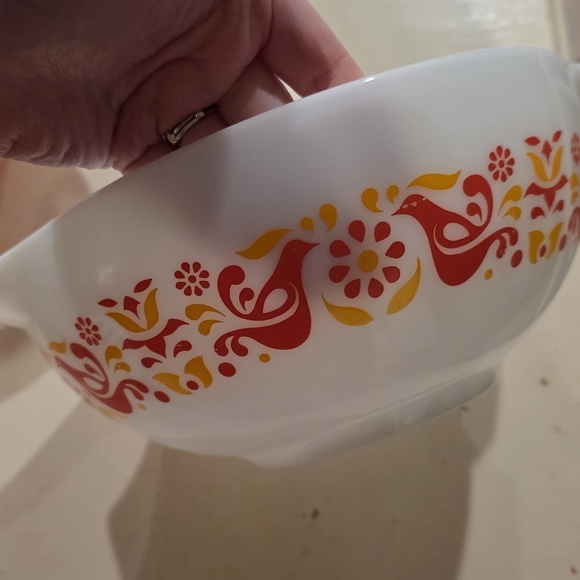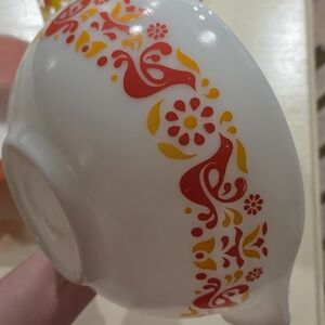 Charming white bowl featuring a vibrant red and yellow bird pattern. Perfect for adding a touch of vintage style to your kitchen.