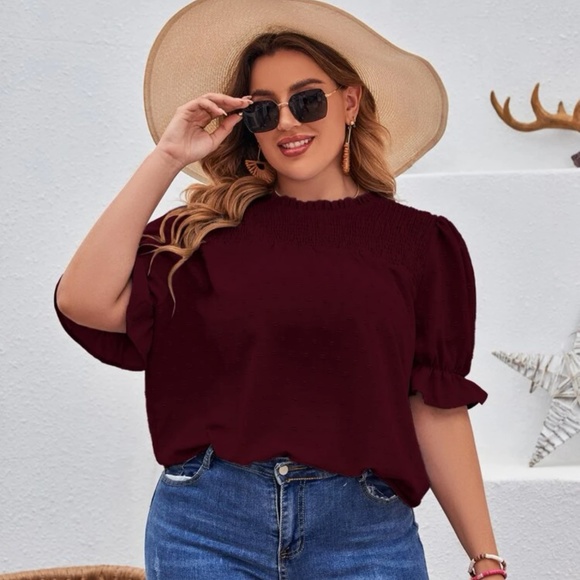 Wine colored frilled blouse with dots. Very flattering. Size runs big. Only worn once.